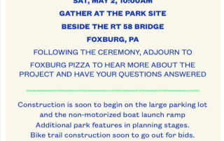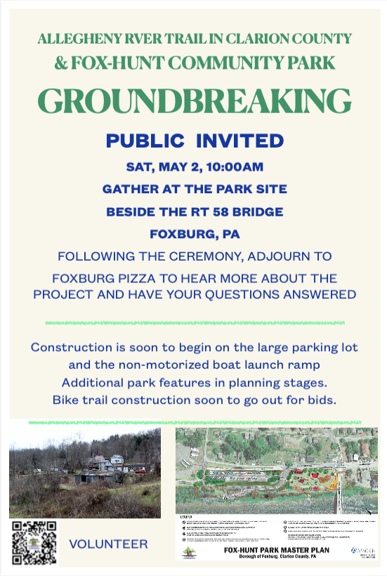 May 2, 2026, 10:00am at Foxburg Bridge – “Ground-breaking for the Fox-Hunt Community Park. Join Us to Celebrate this Beginning!”